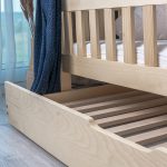Pentru un plus de funcționalitate, pătuțul poate fi echipat cu un sertar multifuncțional – ideal atât pentru depozitare, cât și ca spațiu suplimentar de dormit. Acest sertar nu are o bază continuă, ci este construit pe un cadru solid, format din lamele late din lemn, ceea ce permite o bună circulație a aerului. Sertarul este prevăzut cu roți discrete pentru o glisare ușoară și are o înălțime totală de 20 cm.